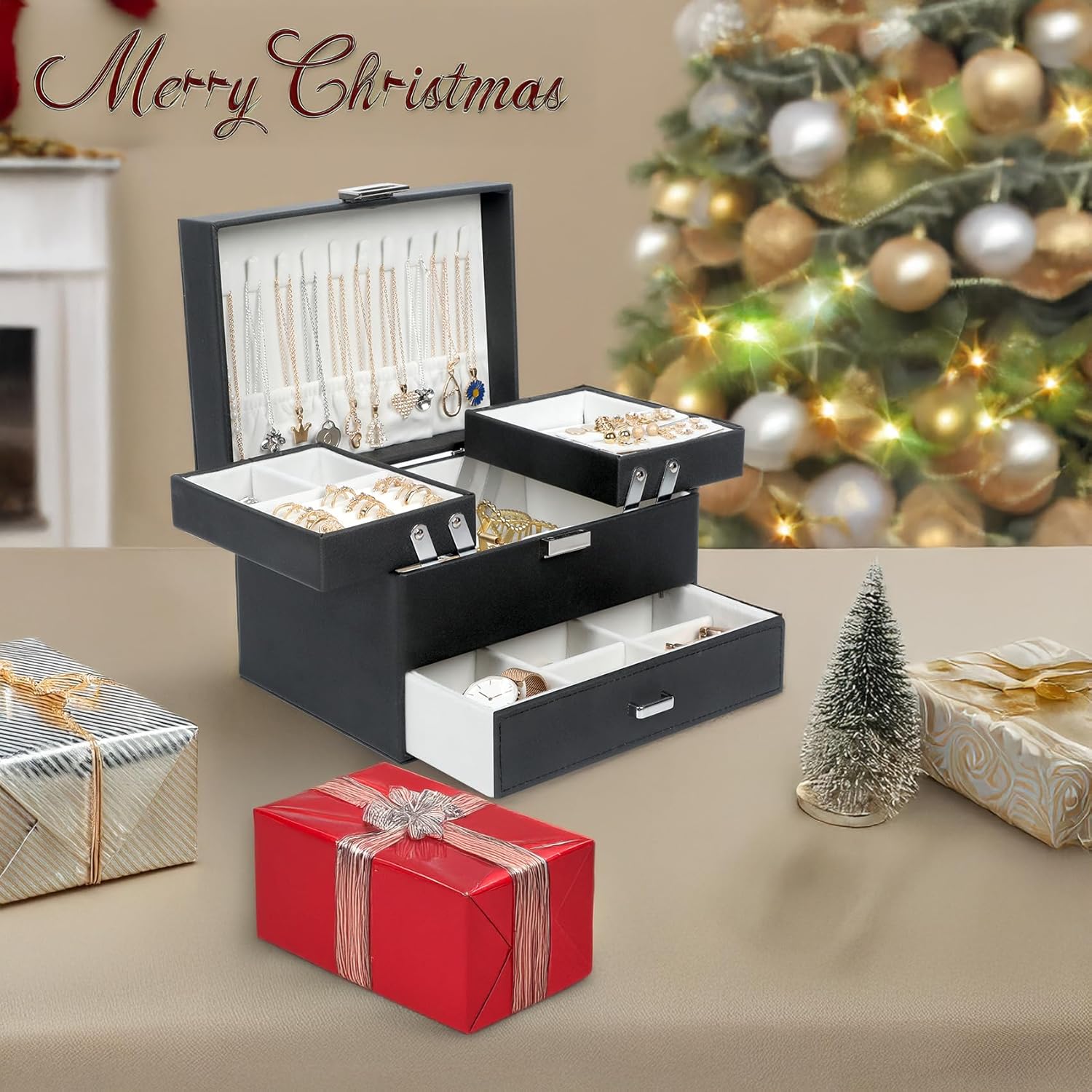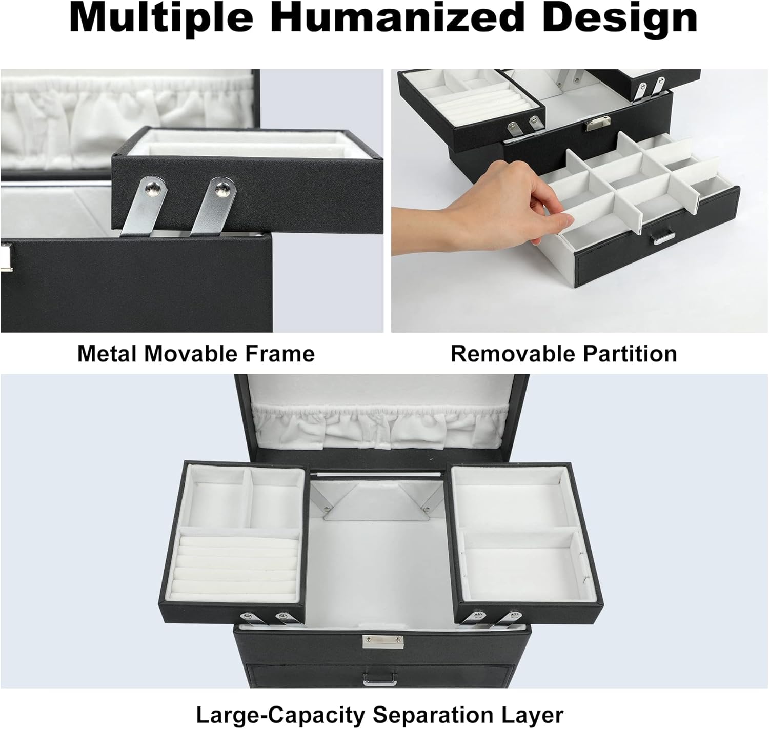 - 3 Layers of Large Capacity: The large jewelry storage box has 5 ring slots, 9 ring boxes, 10 necklace hooks, 26 ear stud holes, 2 adjustable space compartments, when you stretch them out, you will find a large compartment hidden underneath.