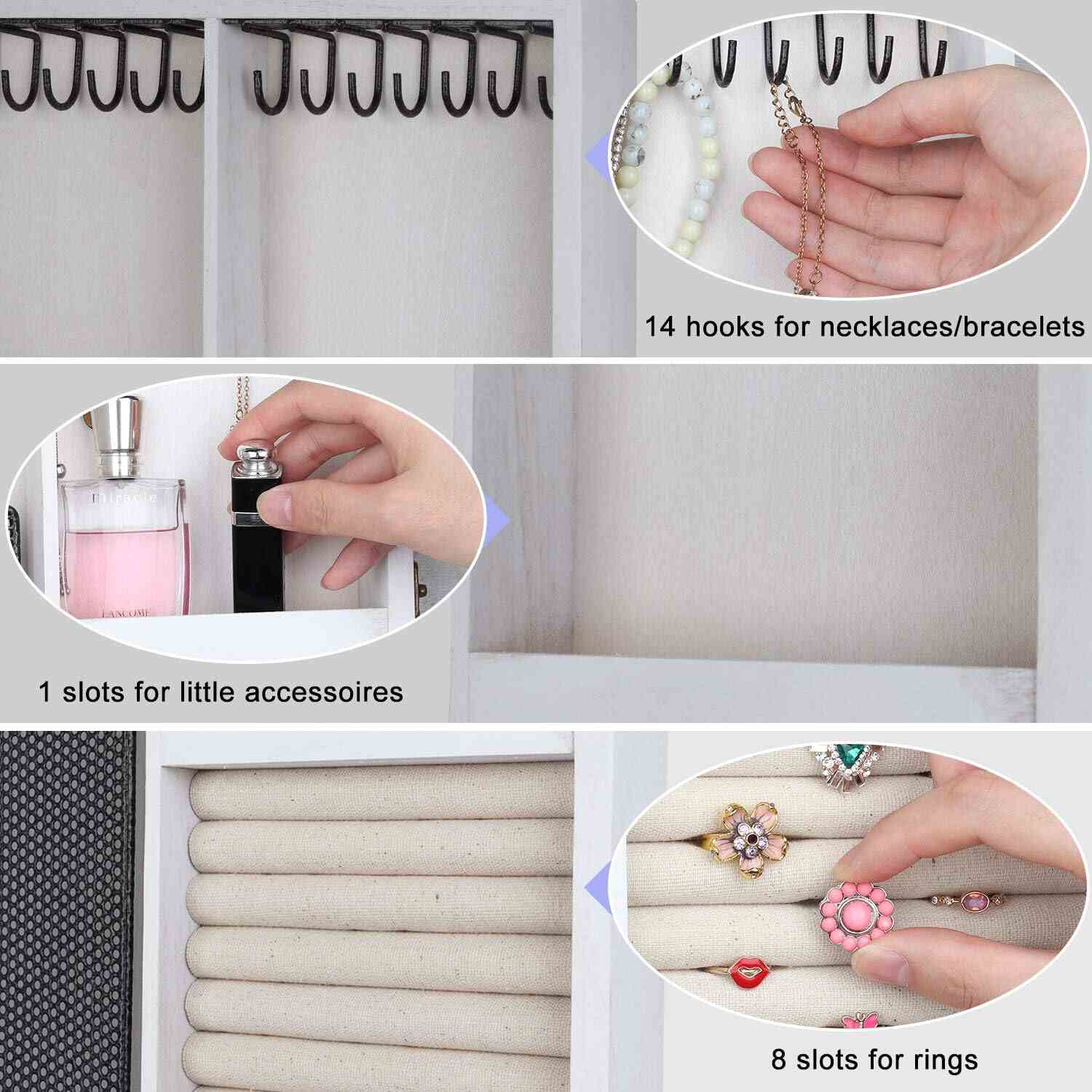 - Large Capacity Jewelry Cabinet: Design with a 8.7x 5.8 inchwire mesh to hang earrings, 7 smooth hooks for necklaces, 7 smooth hooks for bracelet, 8 slots for rings, and a 12.6 inch removable bar for additional items such as bracelet, necklace, glass, watch and more. Also comes with 6 pinning studs for notes, cards or photos on door. The top of this can hold a little accessories