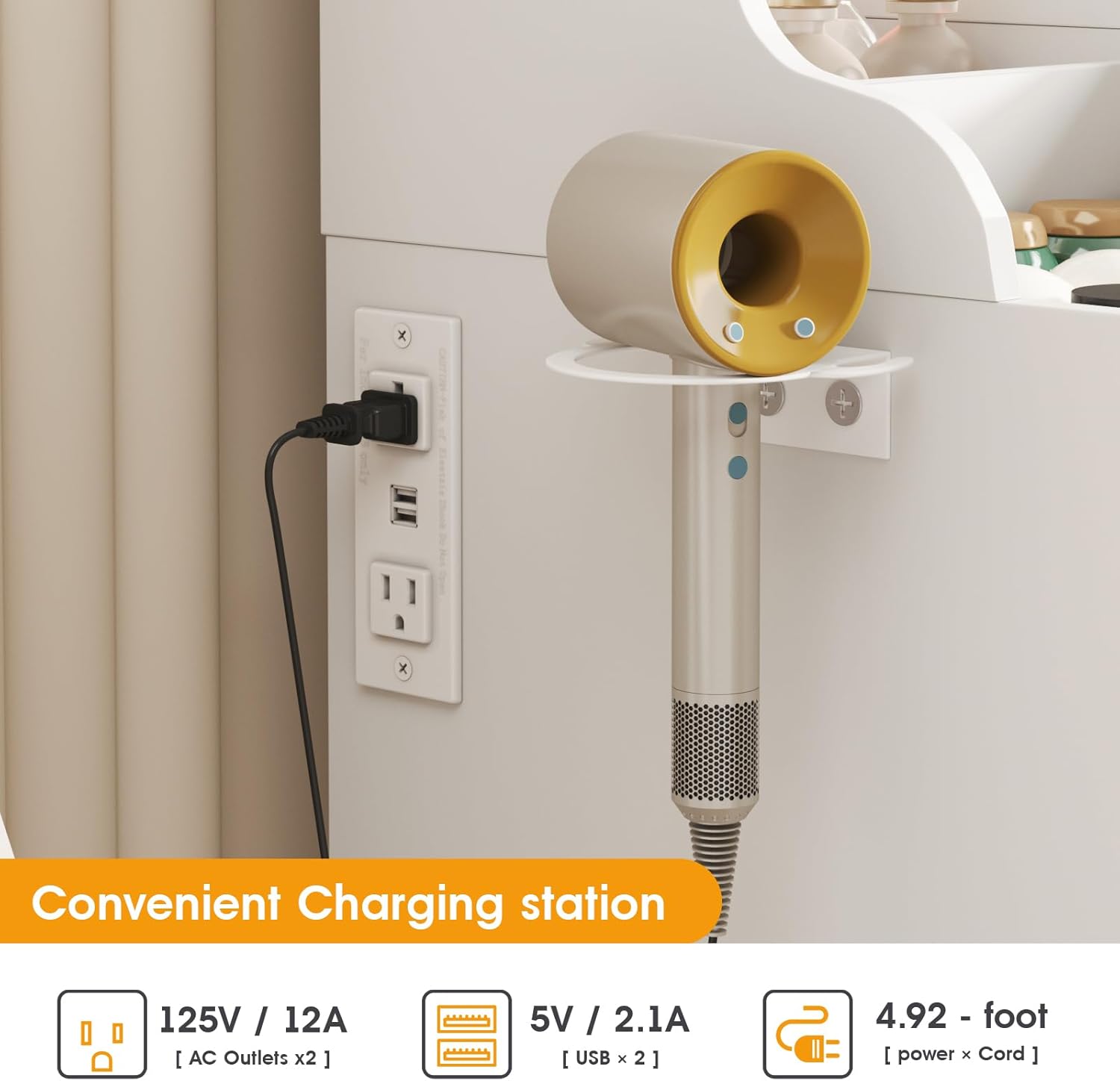 - 【Convenient Charging Station】Never worry about charging your devices again.This vanity table add 2 standard plug sockets and 2 USB ports, you can easily use hair dryer, curling iron in front the mirror, and charge your phone or other mobile devices during makeup.